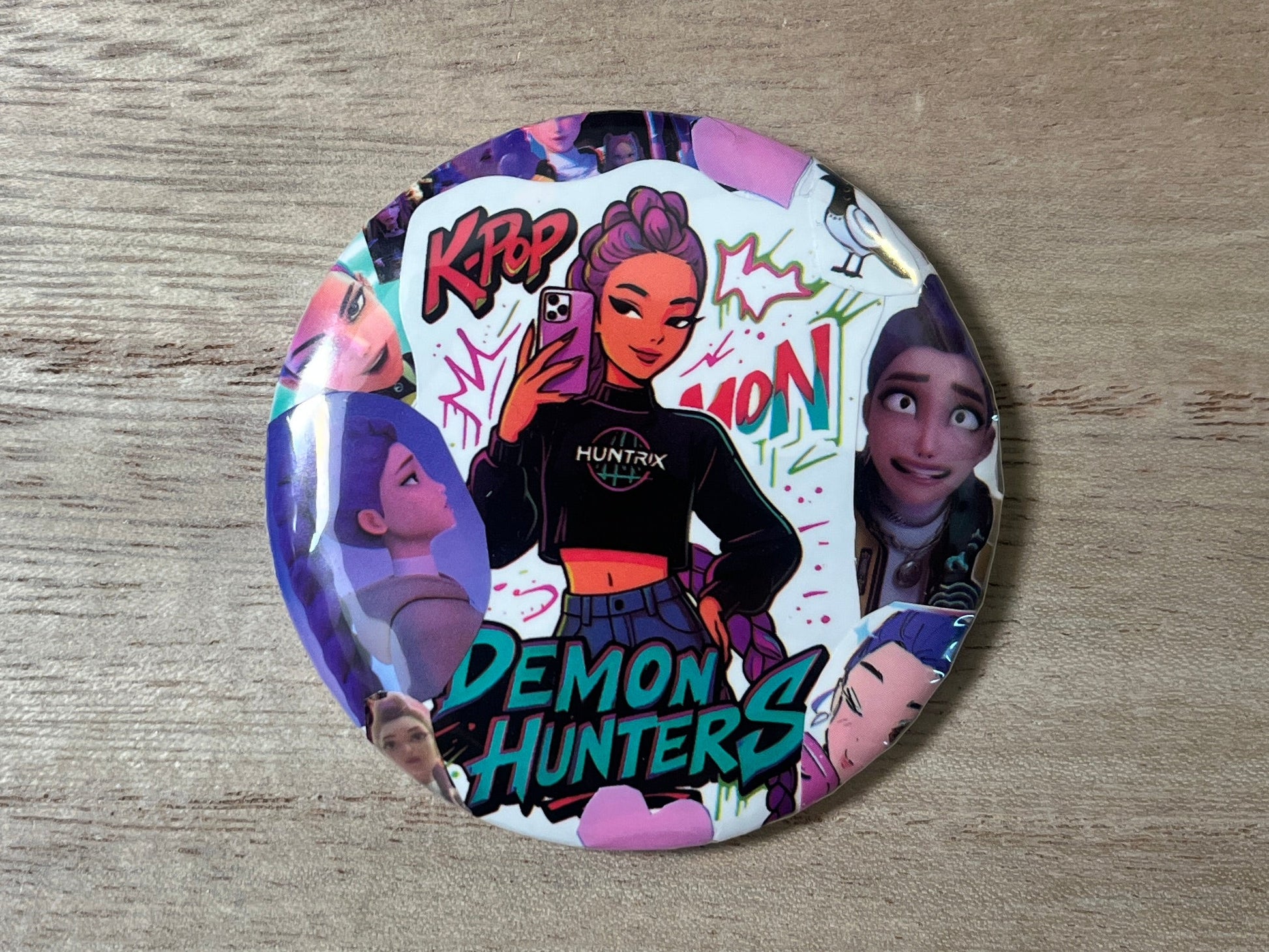 All Hunters unite with this one of a kind Huntrix collage pin! Show love for your favorite group from K-Pop Demon Hunters. Button pins can be secured on most textiles such as cotton, canvas, and polyester. Choose from a specially designed and handmade pin of the Huntrix group or of just one of the members.